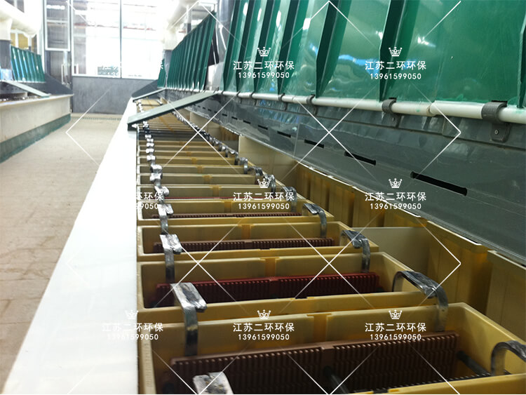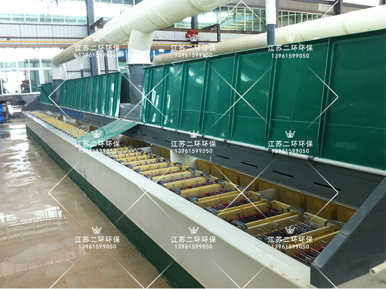極板化成線,又稱為電池外化成酸霧回收裝置。鉛酸蓄電池的正負(fù)極板在稀硫酸中浸泡,并同時通電,進(jìn)行極板外化成,生成鉛氧化物活性物質(zhì)。整個系統(tǒng)有酸槽、酸霧吸罩,酸霧風(fēng)管、酸霧凈化塔構(gòu)成。類似酸洗槽、磷化槽、電解槽裝置。