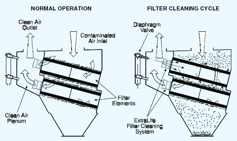2、煙塵在風機風動力作用下,經(jīng)過抽風管道,進入濾筒表面。由于氣流截面突然擴大及氣流分布板的作用,風速驟降,氣流中一部分粗大顆粒在風動力和慣性力的作用下相互碰撞,自然沉降到底部集灰斗;粒度細、密度小的塵粒,通過擴散和篩濾等組合效應(yīng),沉積在濾筒濾料的外表面上而被攔截。